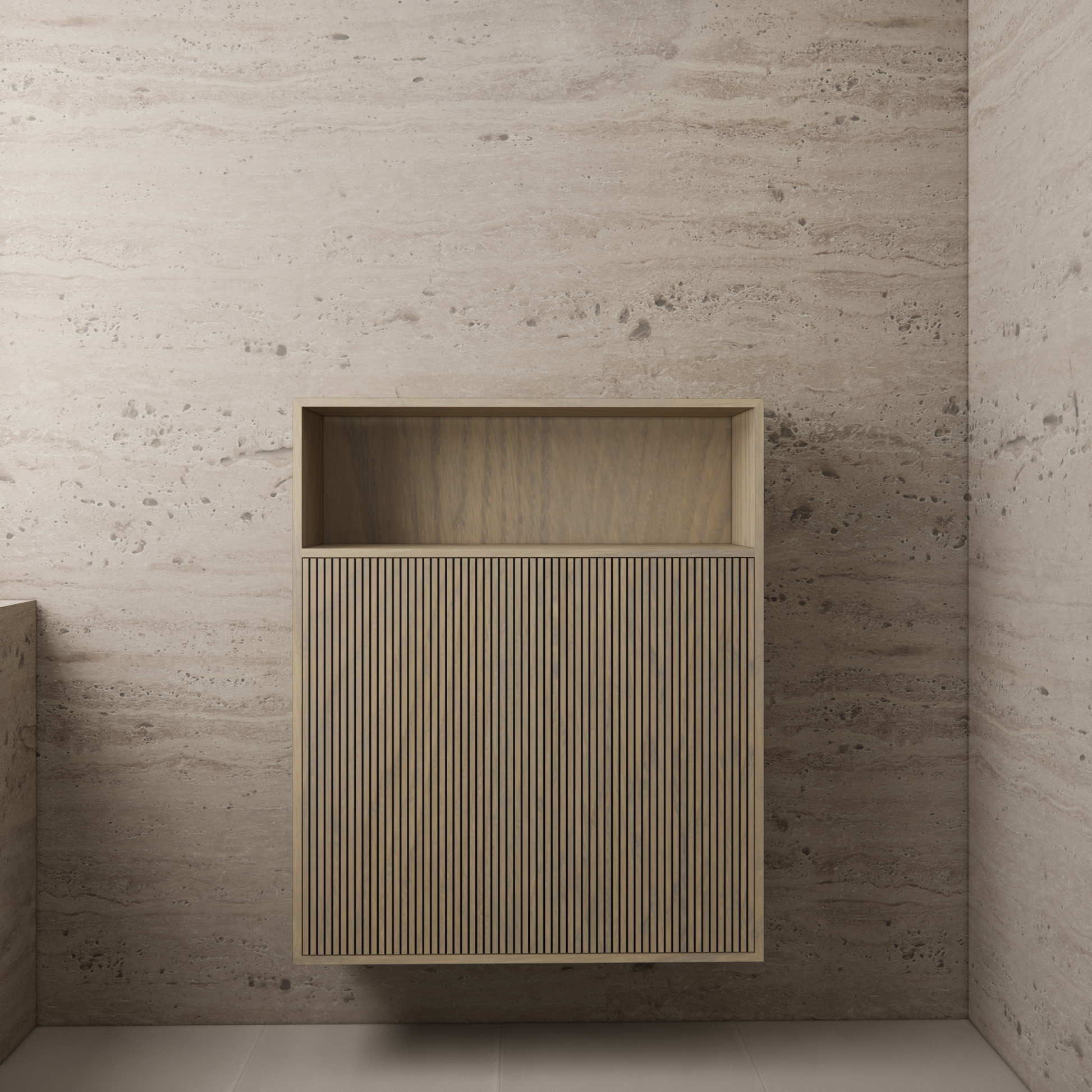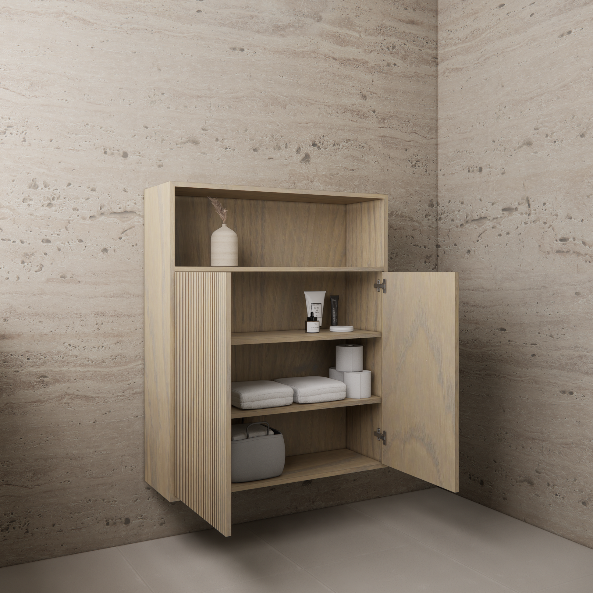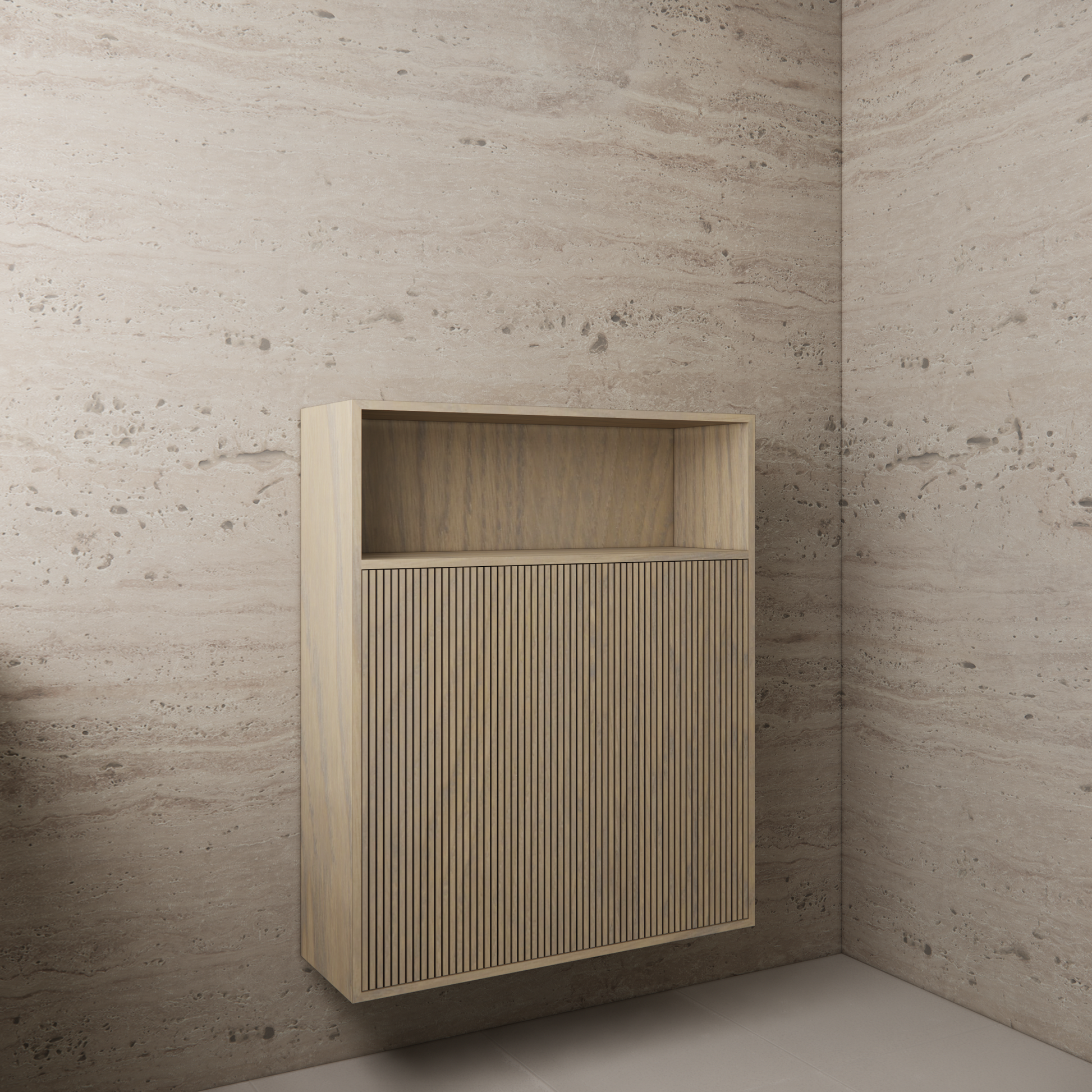 Verrijk je badkamer met de tijdloze elegantie van de Inline Eiken ash grey zwevende kast. Ontworpen om zowel functionaliteit als stijl te bieden. Met meerdere planken biedt deze kast een slimme opbergoplossing voor al je benodigdheden.Met vier legplanken die voldoende ruimte bieden om netjes te organiseren en toch alles binnen handbereik te houden. Vervaardigd uit hoogwaardig MDF met een verfijnde eiken toplaag.De zwevende kast wordt met zorg handmatig afgewerkt met een gekleurde olie, die niet alleen een esthetisch element toevoegt, maar ook een beschermende laag biedt. Het gebruik van eiken fineer maakt deze kast perfect geschikt voor badkamers. Dit omdat het materiaal niet gevoelig is voor luchtvochtigheid. De ingezaagde fronten van dit meubel creëren een subtiel ribbel effect. Met een breedte van 100 cm, een hoogte van 120 cm en een diepte van 30 cm biedt deze zwevende kast voldoende opbergruimte zonder veel vloerruimte in beslag te nemen. Verkrijgbaar in verschillende moderne hout structuren.